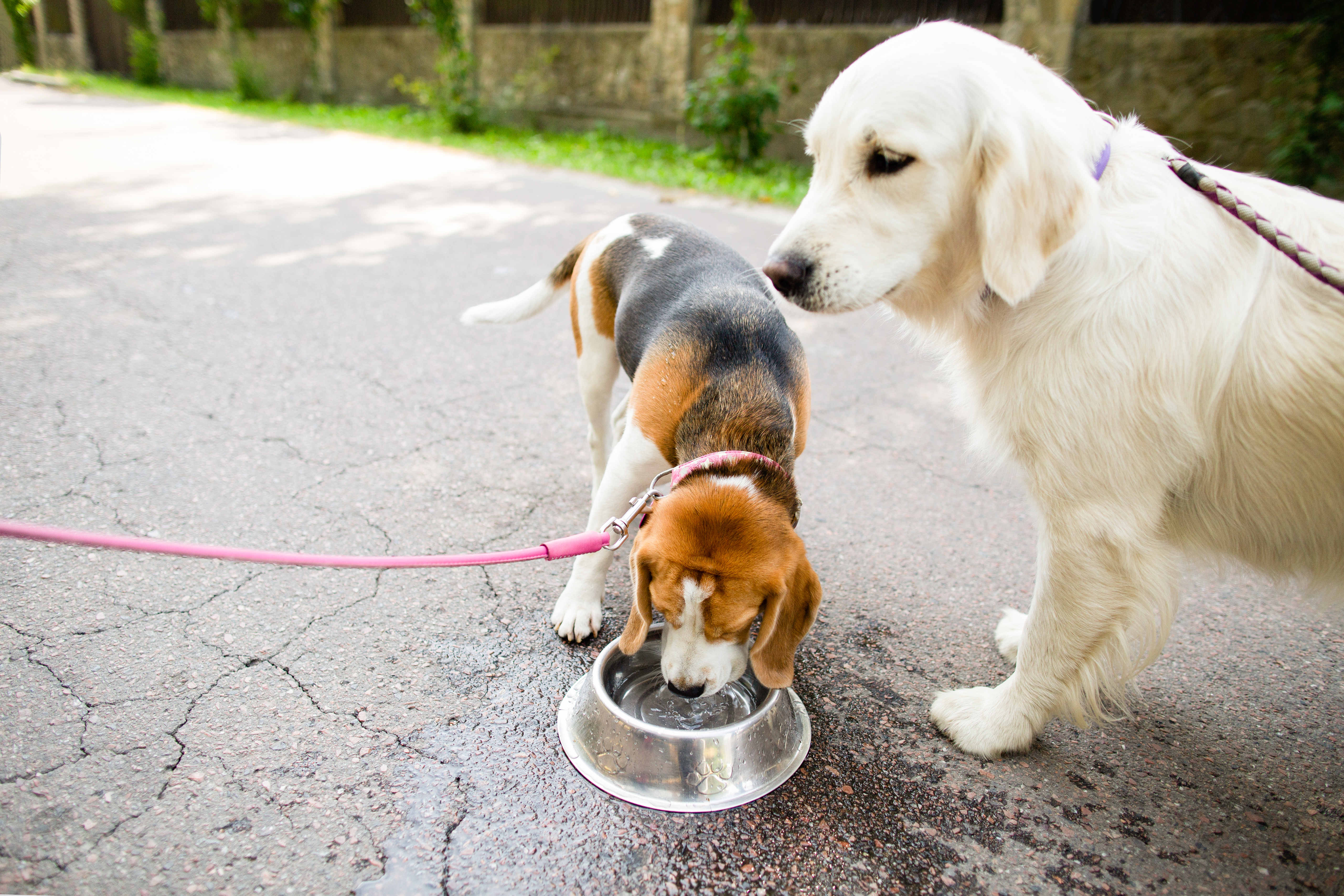 two dogs drinking water from a bowl