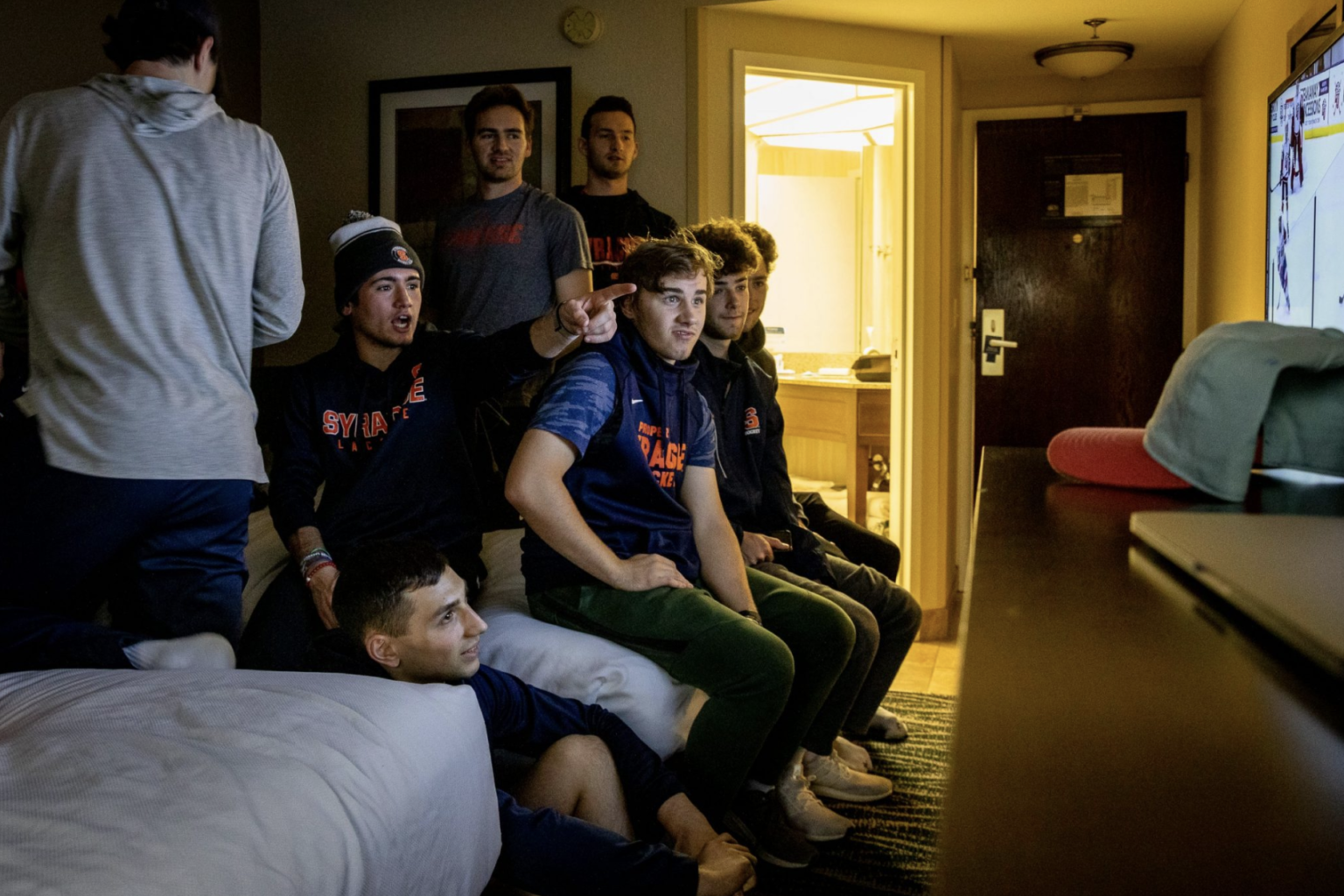 hockey team watching television